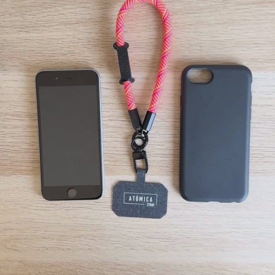 Nuestra cuerda corta Atómica transforma cualquier celular en un accesorio listo para colgar, sin necesidad de carcasa especial. Solo engancha el adaptador universal, cuelga tu strap ¡y listo!